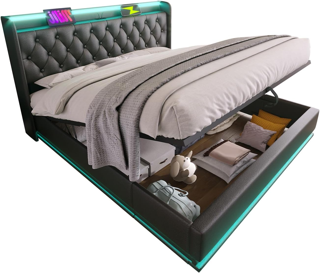 "Experience the perfect blend of innovative design, ample storage, robust support, and modern convenience with this versatile queen bed frame, featuring 360-degree LED lighting, a classic tufted headboard with integrated charging ports, and an easy-to-assemble structure that enhances both the functionality and elegance of your bedroom."