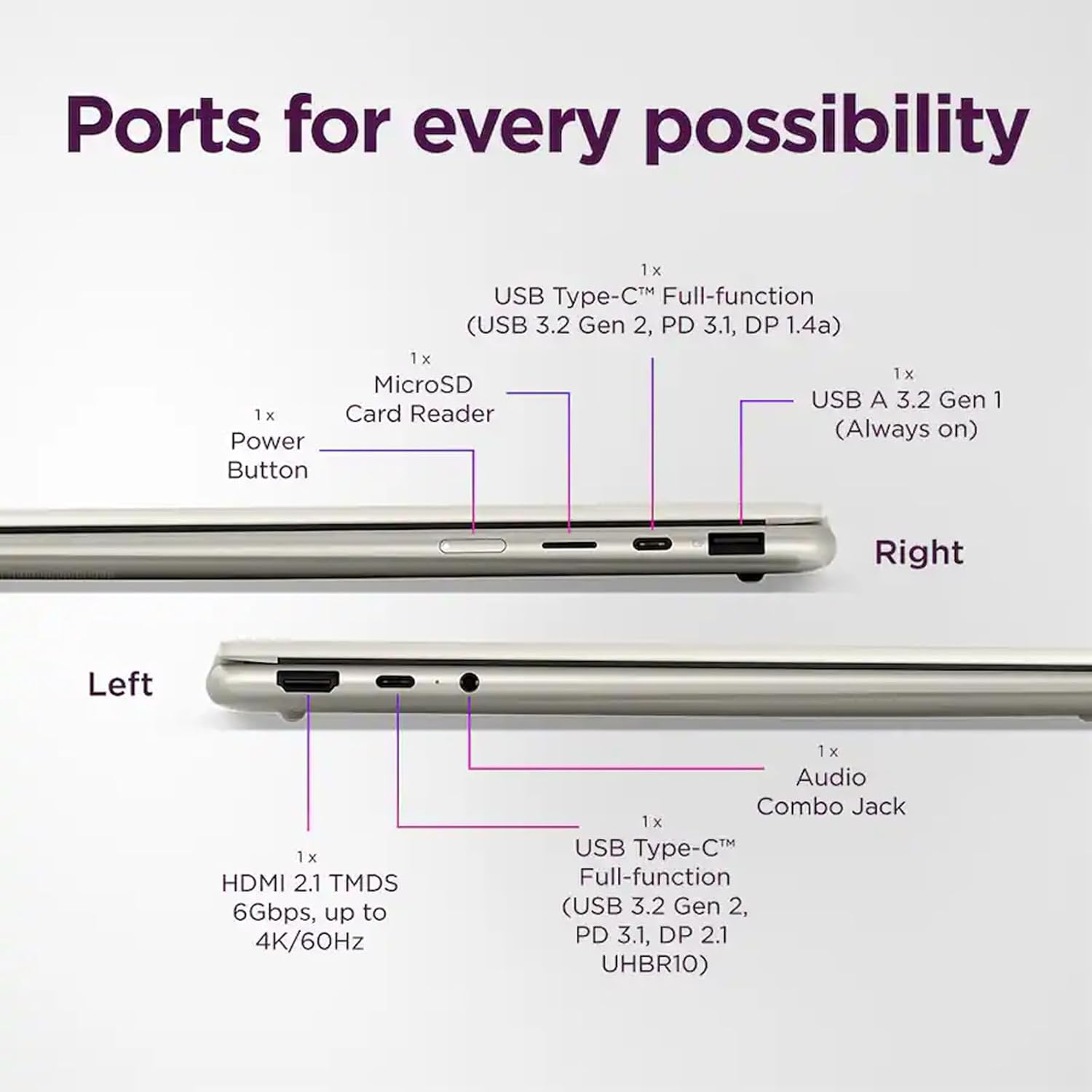 Tech specs AMD Ryzen AI 5 340 (6C / 12T, 2.0 / 4.8GHz, 6MB L2 / 16MB L3) AI PC Category: Copilot+ PC NPU: Integrated AMD Ryzen AI, up to 50 TOPS Graphics : Integrated AMD Radeon 840M Graphics Display : 14" WUXGA (1920x1200) OLED 600nits (peak) / 400nits (typical) Glossy / Anti-fingerprint, 100% DCI-P3, 60Hz, Dolby Vision, TÜV Low Blue Light, DisplayHDR True Black 500, Glass, Touch Number of CPU Cores : 6-core Memory : 16GB Soldered LPDDR5x-7500 Internal Storage: 512GB SSD M.2 2242 PCIe 4.0x4 NVMe Audio Chip : High Definition (HD) Audio, Realtek ALC3306 codec Power Adapter : 65W USB-C Slim (2-pin, Wall-mount) Touchscreen : OGM, 10-point Multi-touch Keyboard: Backlit, English Security Features : Fingerprint reader, Privacy camera Touchpad : Buttonless glass-like Mylar surface multi-touch touchpad, supports Precision TouchPad (PTP), 75 x 120 mm (2.95 x 4.72 inches) Wireless : Wi-Fi 7, 802.11be 2x2 + BT5.4 Standard Ports : 2x USB-C 3.2, 1x USB-A 3.2, 1x HDMI 2.1 (supports resolution up to 4K@60Hz), 1x Headphone / mic combo, 1x MicroSD card reader Battery life: Up to 13.5 Hours Case Color : Seashell Dimensions (WxDxH) : 12.48 x 8.98 x 0.61 inches Weight : 3.04 lbs Operating System : Windows 11 Home, English Accessories: 16GB USB Pen