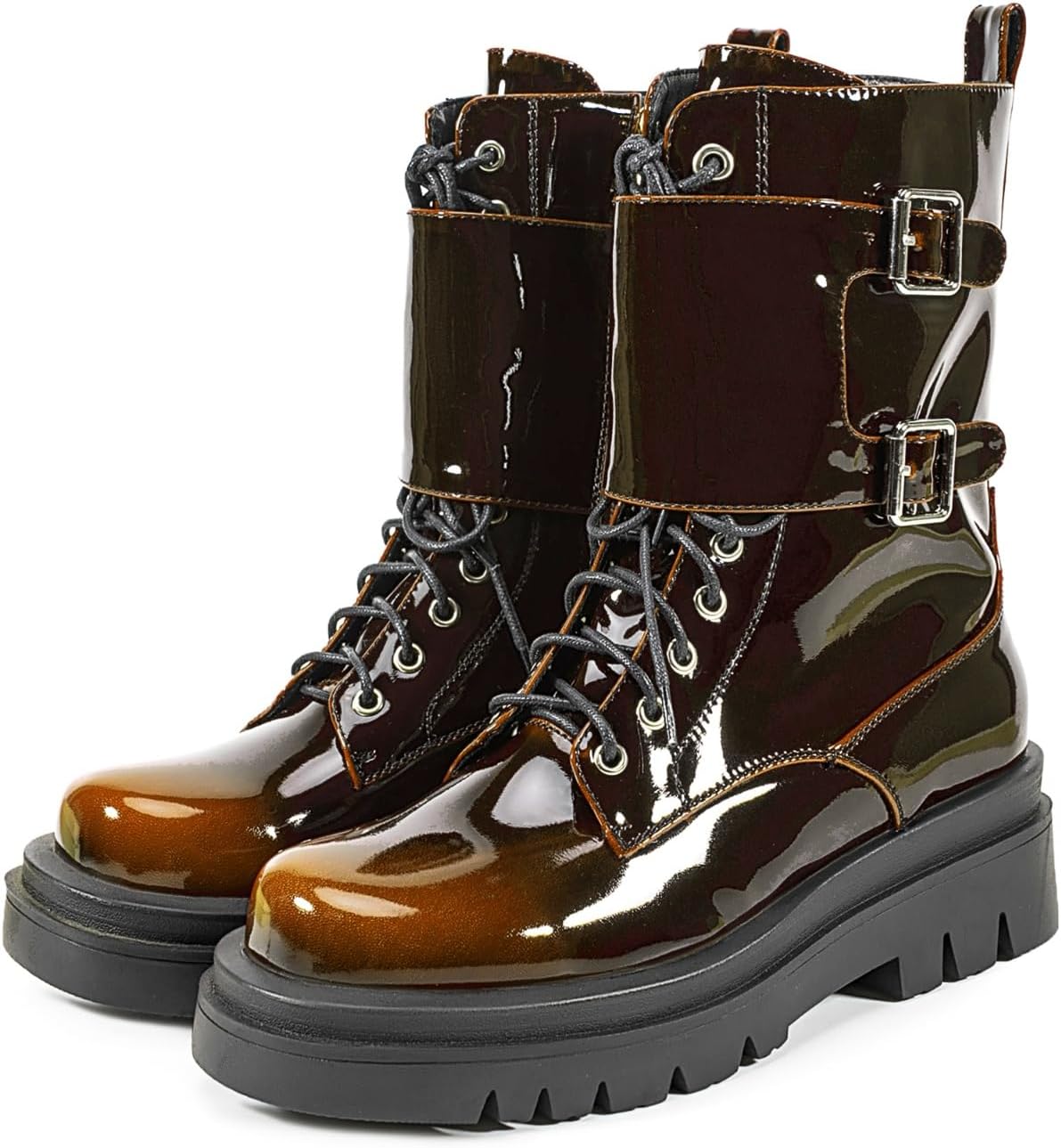 Crafted with attention to detail, handmade, these boots feature a stunning silver color that effortlessly catches the eye. The metallic leather adds a touch of glamour, making these boots the ideal choice for those who love to stand out from the crowd. The lace-up design not only adds a trendy touch but also allows you to adjust the fit according to your preference, providing maximum support and stability. A platform sole and chunky heel offer a stylish lift while ensuring all-day comfort. With a round toe silhouette, these boots provide ample space for your toes to wiggle and flex, promoting natural movement. The zipper closure ensures easy on and off, saving you time and effort. Our Metallic Combat Boots are built to last, thanks to the lug sole that offers excellent traction and durability. It enhances stability, allowing you to tackle various terrains confidently. Whether you're dressing up for a night out or want to add a touch of edginess to your everyday attire, our Metallic Combat Boots for Women are the perfect choice. Embrace your individuality and step out in style with these fashionable mid calf boots.